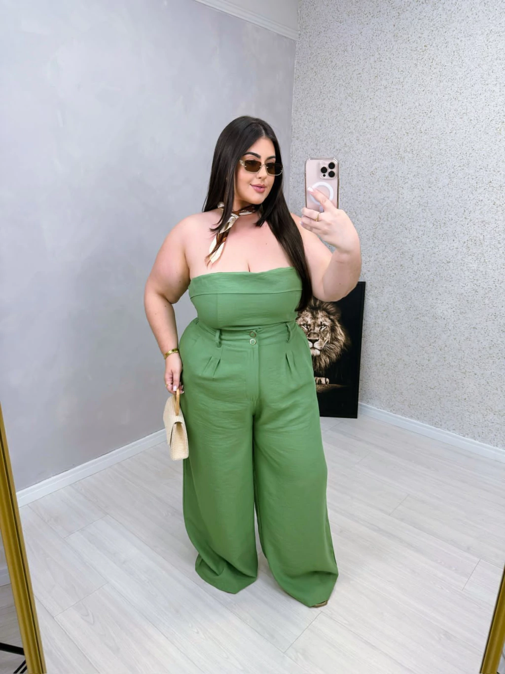 Conjunto composto por Cropped tomara que caia  calça pantalona